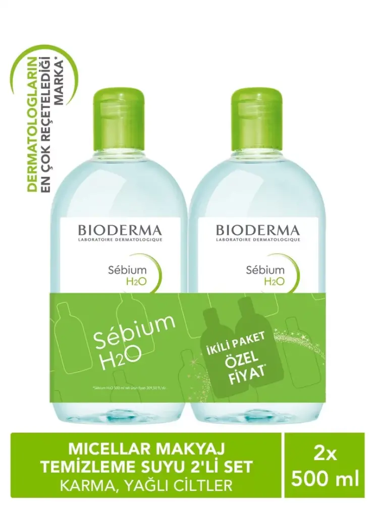 Bioderma Sebium H2O 500 ml 1+1, karma ve yağlı ciltler için durulama gerektirmeyen temizleyici ve makyaj çıkarıcı misel solüsyondur.