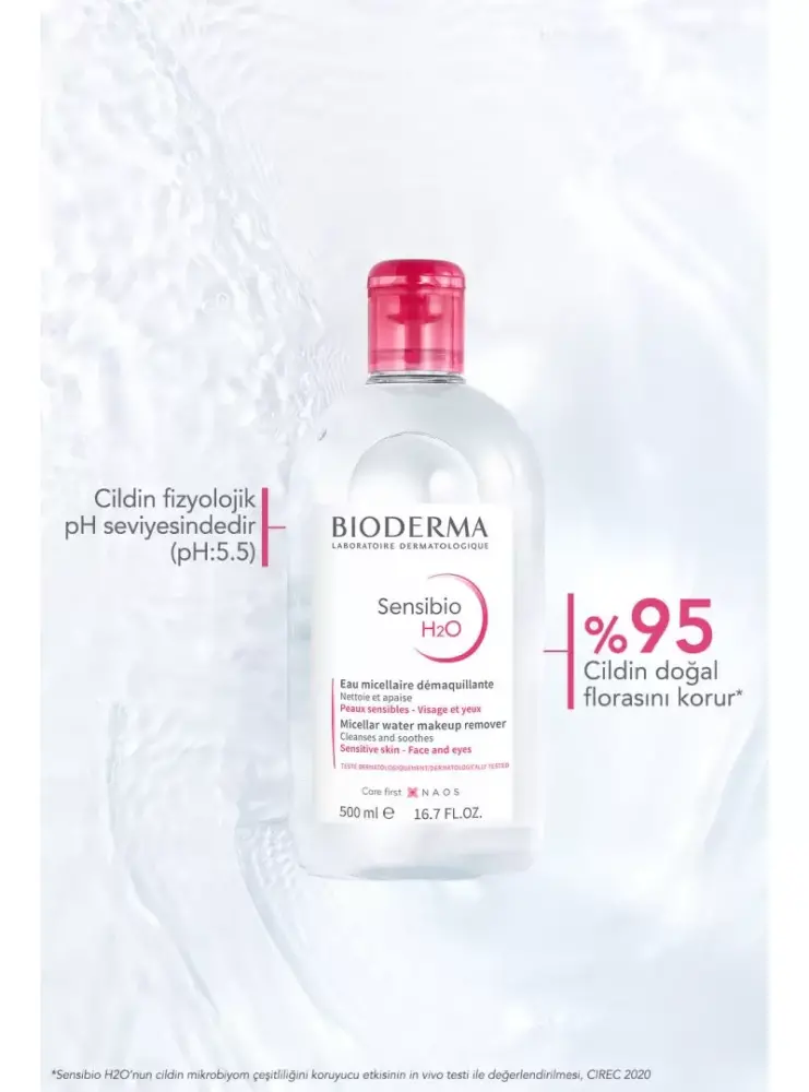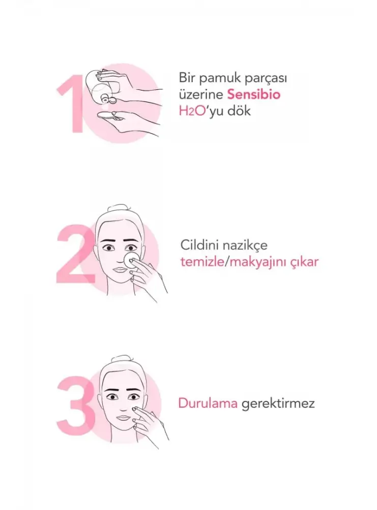 Özel olarak tasarlanmış Bioderma Sensibio H2O durulamaya gerek duyulmadan kullanılabilen nazik bir temizleme solüsyonudur,