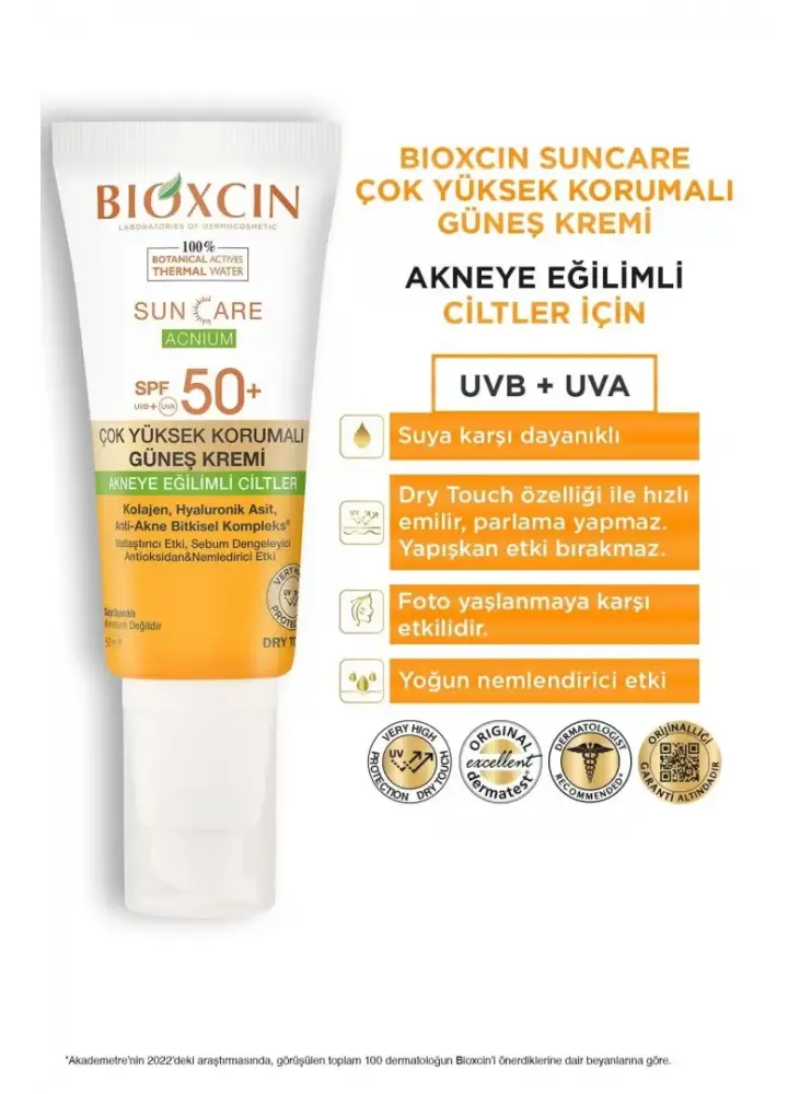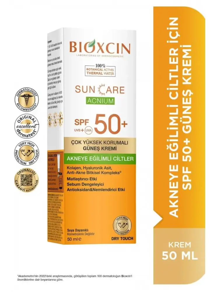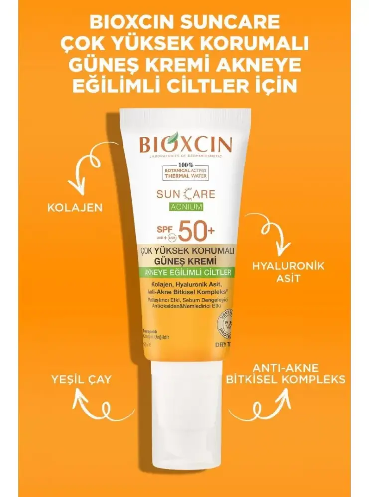 Bioxcin Sun Care Acnium Akneye Eğilimli Ciltler İçin Güneş Kremi SPF 50+, akneye eğilimli ciltler için özel olarak formüle edilmiştir. SPF 50+ koruma faktörü ile güneşin zararlı UV ışınlarından yüksek seviyede korunma sağlarken, akneye eğilimli ciltlerdeki aşırı yağı kontrol altına alır ve ciltteki sivilce oluşumunu engellemeye yardımcı olur. Hafif, yağsız yapısı ve matlaştırıcı etkisiyle ciltte ferah bir his bırakır. Bu ürün, akneye karşı etkili koruma sağlarken, cildin doğal nem dengesini korur ve sağlıklı bir görünüm sunar.