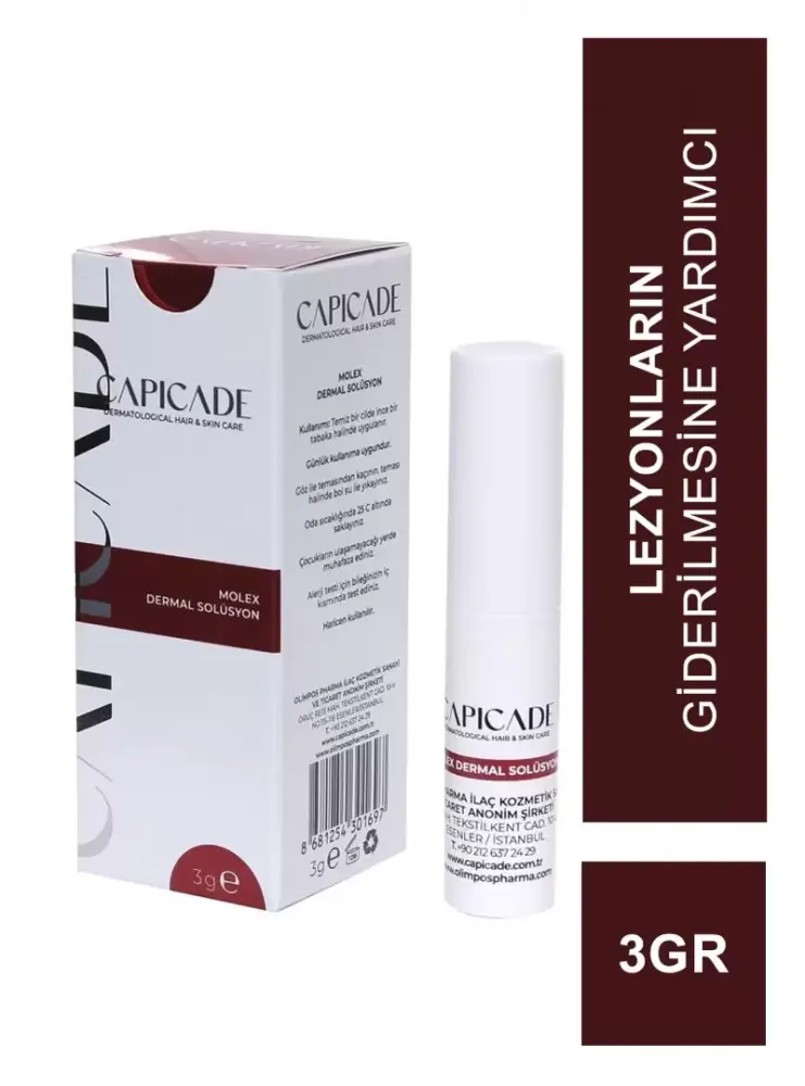 Capicade Molex Dermal Solüsyon, hedefe yönelik uygulama sunan bir dermal bakım ürünüdür. Lokal kullanım için tasarlanan özel formülü sayesinde yalnızca uygulanan bölgeye etki eder ve çevre ciltle teması en aza indirmeyi hedefler.