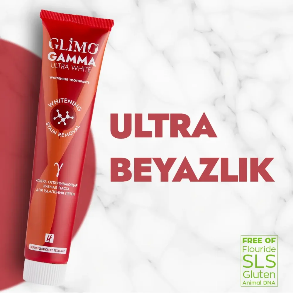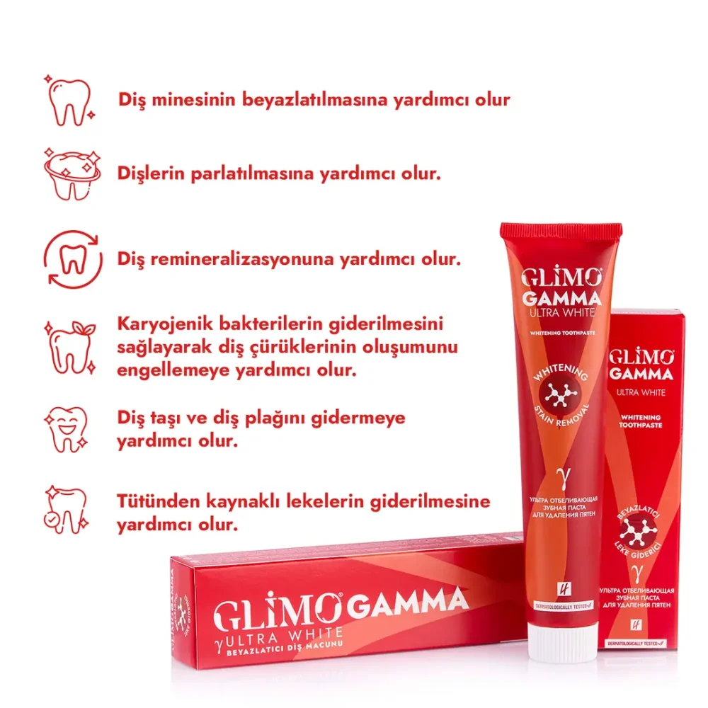 Diş beyazlatıcı macun Glimo Gamma Ultra White, içerisinde bulunan koruyucular, beyazlatıcılar ve onarıcılar sayesinde ilk fırçalamadan itibaren düzenli kullanımda etkisini gösteren beyazlatıcı diş macunudur.