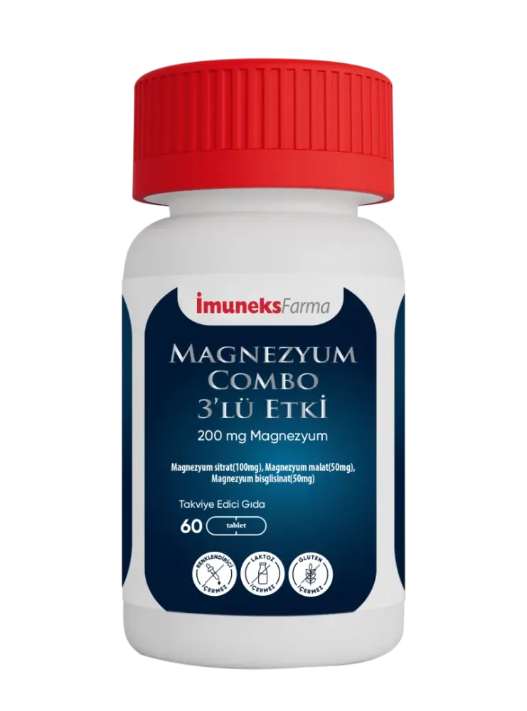 ÜRÜN AÇIKLAMASI; İmuneks Magnezyum Combo 3'lü Etki, magnezyum içeren bir takviye ürünüdür. Magnezyum, vücutta pek çok biyolojik fonksiyon için gerekli olan önemli bir mineraldir. Bu ürün, magnezyumun yanı sıra ek bileşenlerle zenginleştirilmiş formülüyle vücutta üç farklı etkiyi hedefler: kas fonksiyonlarının desteklenmesi, sinir sisteminin sağlıklı çalışması ve enerji metabolizmasının düzenlenmesi. 60 tabletlik avantajlı ambalajı, uzun süreli kullanım için uygundur.