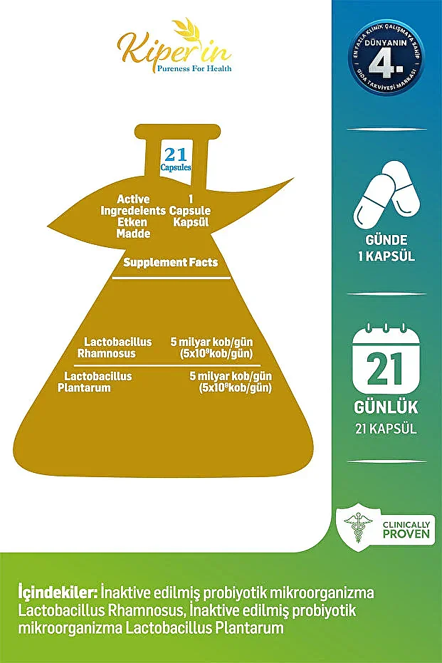 Kiperin Postbiyotik 21 Kapsül; sindirim sistemini desteklemek isteyenler için özenle formüle edilmiş bir üründür. İçeriğindeki postbiyotikler, bağırsak dengesini korumaya yardımcı olurken genel sindirim konforunuza katkı sağlamayı hedefler.