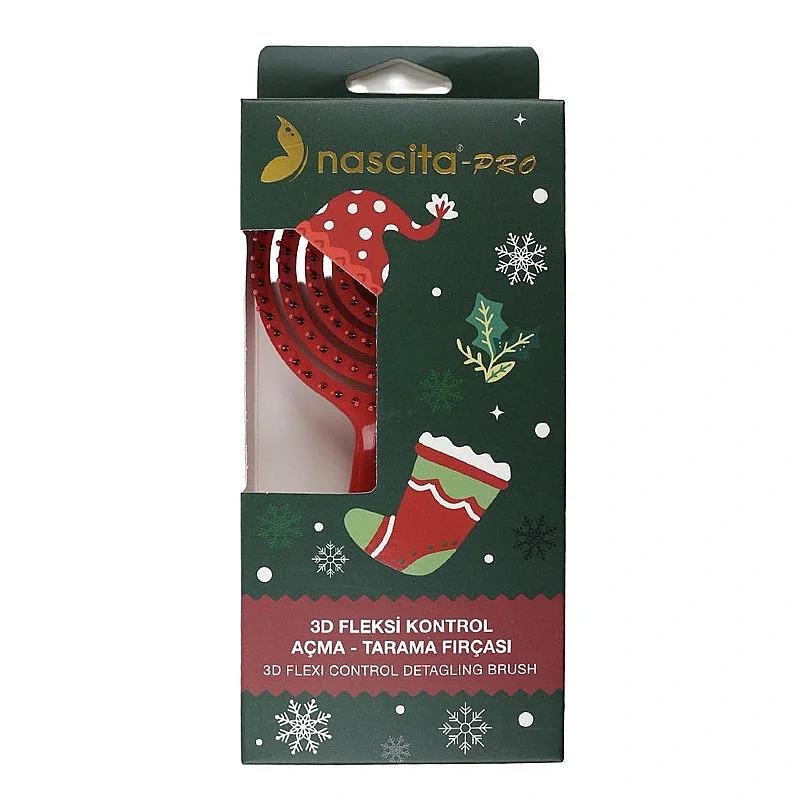Yılbaşı ruhunu saç bakım rutininize taşıyan Nascita 3D Fleksi Saç Fırçası, hem şık tasarımı hem de fonksiyonel yapısıyla öne çıkar. Esnek 3D yapısı sayesinde saçlara zarar vermeden kolayca açılmasını sağlar ve günlük kullanımda konfor sunar.