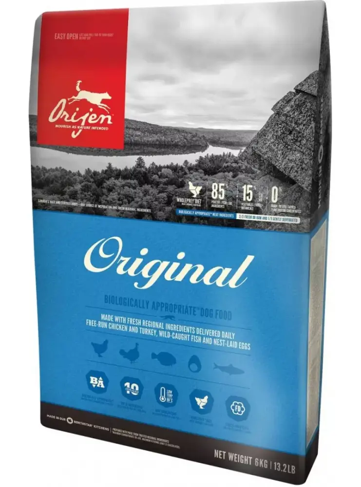 -Diğer hiçbir köpek mamasına benzemeyen ORIJEN’in etlerinin 2/3’ü TAZE (soğutulmuş, koruyucu içermez) veya başlıca 10 içeriği dâhil ÇİĞ’dir (şoklayarak dondurulmuş, koruyucu içermez).