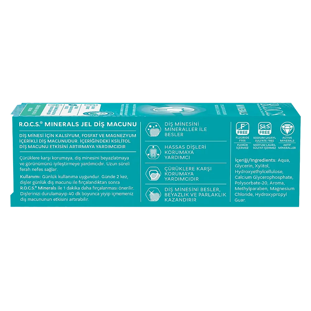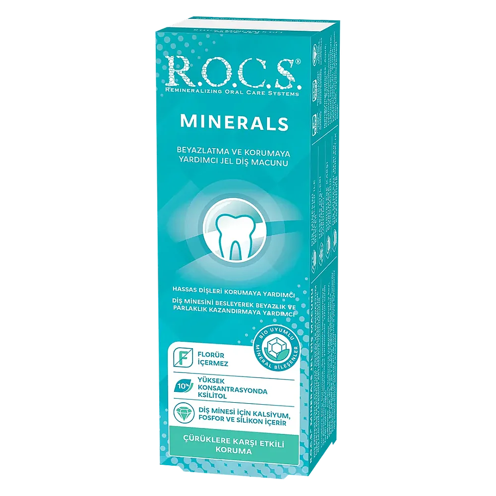 ROCS Mineral Jel, diş minesini kalsiyum, magnezyum, fosfat ile beslemeye yardımcı olmak için geliştirilmiş bir üründür. Diş üzerinde ince bir film tabakası oluşturarak, diş minesini beslemeye ve güçlendirmeye yardımcı olur.
