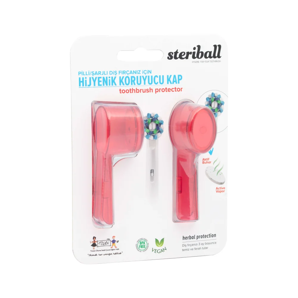 Steriball Elektrikli diş fırçaları için hijyenik koruma kabı. Özel geliştirilmiş tableti, formülündeki Kekik, Nane, Çay Ağacı ve Defne Yaprağı Yağları’nın buharı, fırça kılları arasında dolaşarak 3 ay boyunca bakteri ve mantar oluşumuna karşı %99’a kadar etkin bir koruma sağlar. Etkinliği klinik olarak test edilmiştir.
