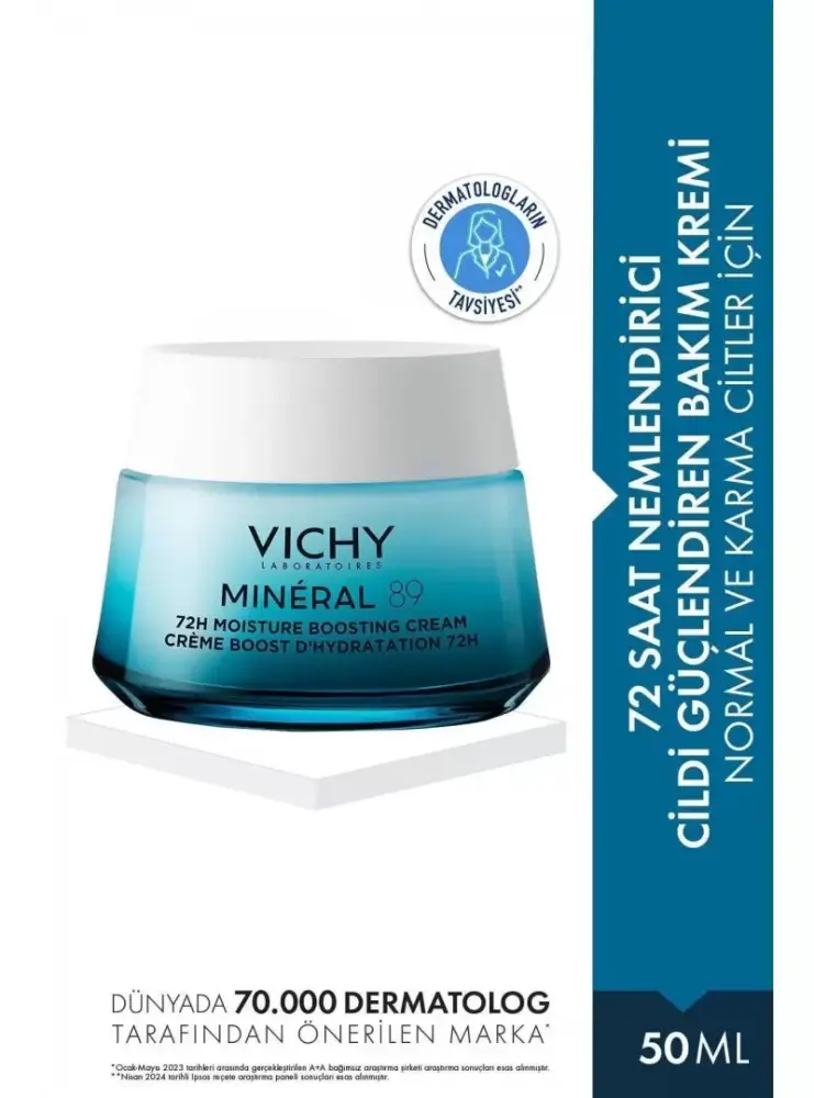 Vichy Mineral 89 Boosting Cream, normal ve karma ciltler için özel olarak formüle edilmiş, hafif dokulu bir nemlendirici kremdir. Cildi derinlemesine nemlendirirken, aynı zamanda cilt bariyerini güçlendirir ve çevresel faktörlere karşı korur. İçeriğindeki Vichy Mineralize Su ve hyalüronik asit, cildi nemlendirir, yeniler ve ciltteki nem dengesini sağlar.
