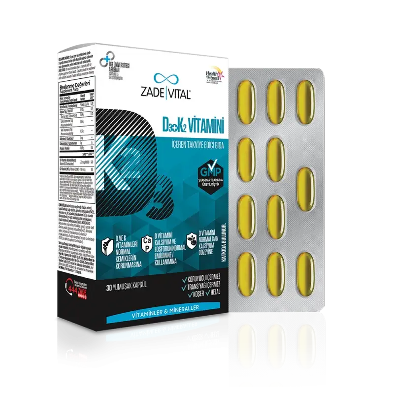 - Zade Vital D3 + K2 Vitamini 30 Kapsül, D vitamini ve K2 vitamini kombinasyonunu içeren etkili bir takviye edici gıda ürünüdür. Bu iki vitaminin birleşimi, kemik sağlığı, bağışıklık sistemi ve kalp sağlığı için kritik öneme sahiptir.